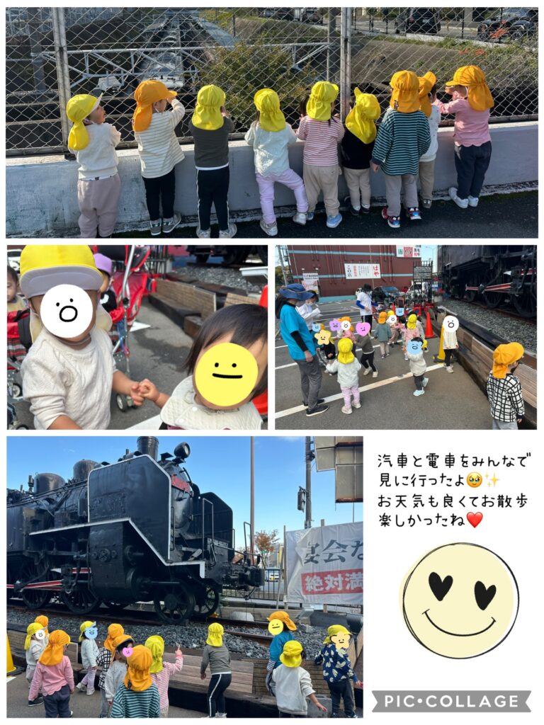 11月26日(水) 周辺散歩 2025.11.26 [今日のようす] 今日は周辺散歩にいきました♪ ぱんだ組さんとうさぎ組さんのお友達で手を繋ぎ、ぱんだ組さんはうさぎ組さんを引っ張って歩いてくれました⭐️ 汽車を見に行くと伝えると、「きしゃ!きしゃ!」と嬉しそうにお話をしながら歩いていました🚂 りす組さんは大きな汽車に興味深々でニコニコと汽車を眺めていましたよ(^^) そしていつもより遠回りをし電車を見て保育園に帰ってきました🎵 #未来保育園#小規模保育園#周辺散歩