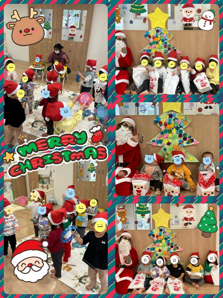 12月24日(水)🎅クリスマス会🎄 2025.12.25 [今日のようす] 今日はクリスマスイブ🎄 みんなでクリスマス会をしました⭐️ クリスマスにちなんだ絵本を見たり、 すずやタンバリンを使い音楽に合わせて楽器を 鳴らしたりして楽しく過ごしました🎀 そして星探しをし、みんなでツリーを完成させました🎄 その後、サンタさん登場🎅⭐️ びっくりして泣いてしまう子もいましたが、 サンタさんを見て喜んでいる子もいました🌱 サンタさんから、一人ずつプレゼントをもらい、 とっても嬉しそうな子ども達でした❤️❤️