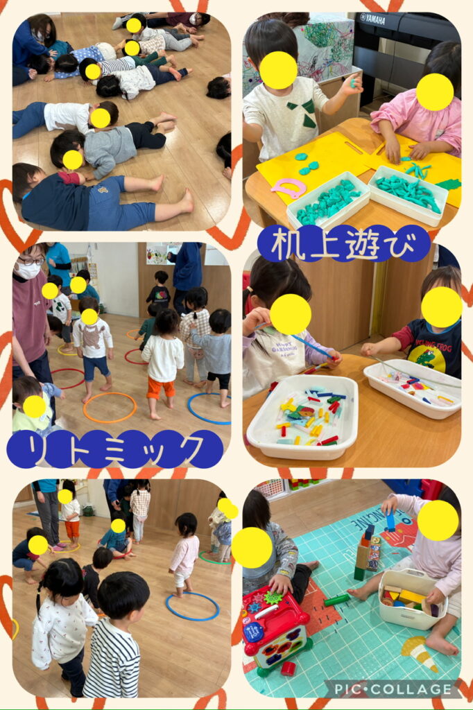 3月23日(月) リトミック💫机上遊び 2026.03.24 [今日のようす] 今日はみんなでリトミックをしました♪ ピアノの音に合わせてのびのびと身体を動かしていましたよ! その後は、各クラスごとに分かれて遊びました⭐️ ぱんだ組さんは、粘土遊びをしました。 色々な形を集中して作っていましたよ☺️! うさぎ組さんは、紐通しをしました。 長い紐にもとっても上手に紐通しができる様になってきましたよ(^^) りす組さんは、色々な知育玩具で遊びました。 自分で好きな玩具を選んで楽しんでいましたよ!