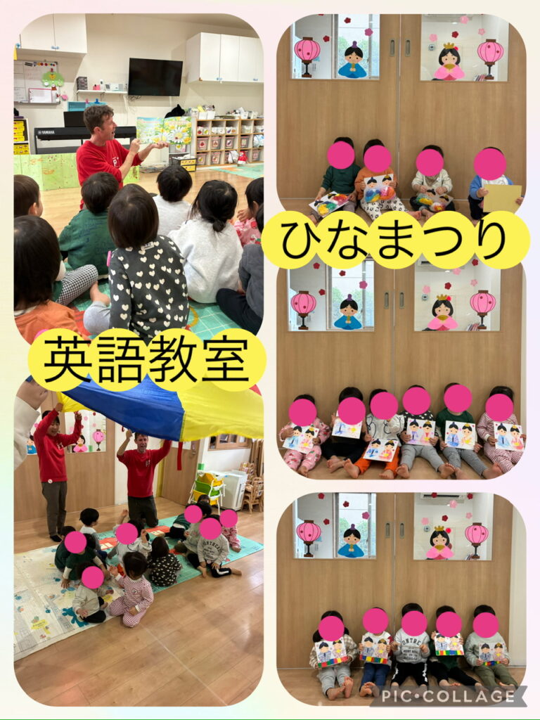3月3日(火)英語教室🎎ひなまつり 2026.03.03 [今日のようす] 今日は、英語教室がありました🎵 ジェイミー先生と一緒に音楽に合わせて身体を動かしたり、先生の真似をしたり、みんなにこにこ笑顔で元気いっぱい☺️! 今日は、パラバルーンに挑戦しました!みんなで持って上下に揺らしたり、回ると大喜び✨ 嬉しそうな声が沢山聞こえてきました♪ その後は、ひなまつりをしました🎎 ひなまつりのペープサートをとっても集中して見ていましたよ(^^) 作った作品もみんなに見せ合い、楽しいひなまつりを過ごしていましたよ⭐️