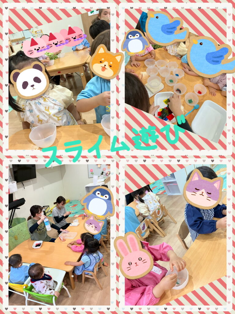 出来上がったスライムをツンツンつついたり、ギュギュッとにぎったり、それぞれの楽しみ方で遊んでいましたよ☺️
