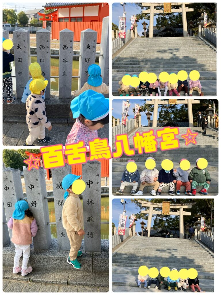 皆様明けましておめでとうございます㊗️ 年末年始の長いお休みはいかがお過ごしでしたか?いよいよ今日から令和8年の保育がスタートしました♪ 登園したお友だちからは笑顔で新年の挨拶をしてくれたり、お正月の楽しかった出来事を話してくれたり、少し会わない間に随分言葉を覚えていて驚きました❣️ 今日は皆んなで百舌鳥八幡宮⛩️まで新年のご挨拶に出かけましたよ😊