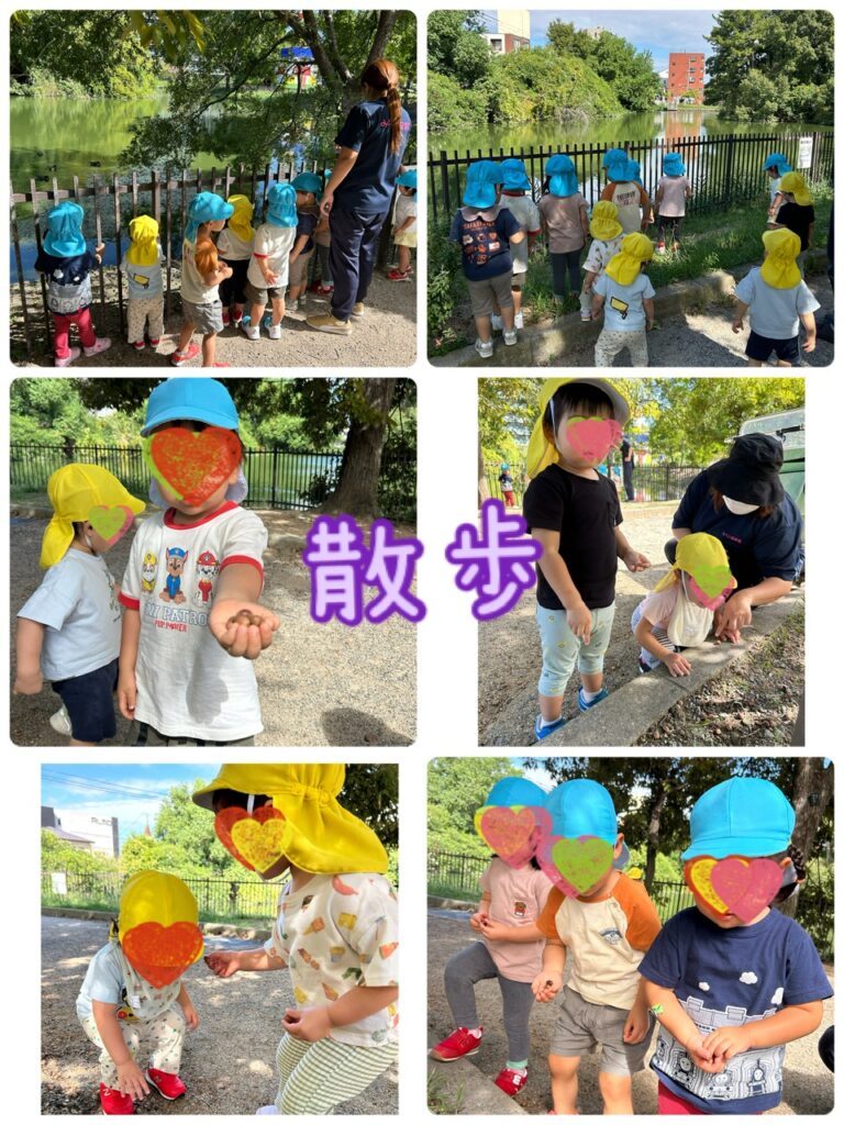 いちご組さんとめろん組さんは百舌鳥八幡駅の近くの向陵公園⛲️まで散歩車と徒歩組に分かれてお散歩に出かけました😊