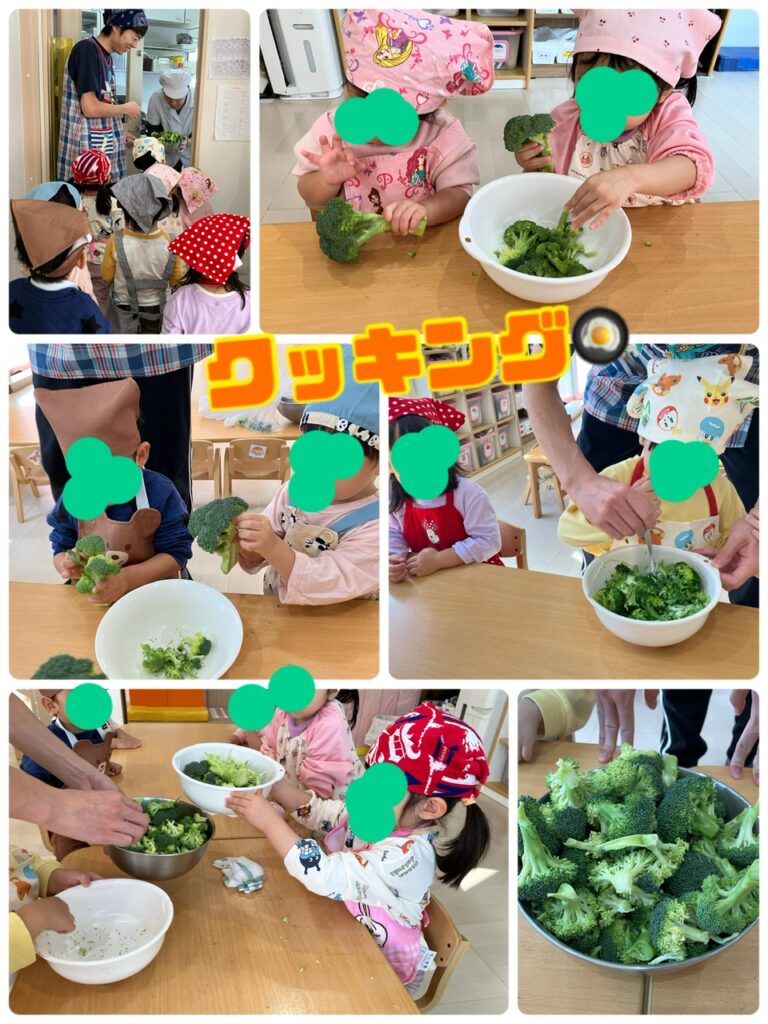 ブロッコリー🥦に少し切り込みを入れて手で千切りました❣️ 丁度良い大きさに千切ったブロッコリーを調理さんに柔らかく茹でてもらいマヨネーズで和えました🥣 皆んなとっても集中して行ってましたよ✨「またクッキングしようね!」と先生におねだりするぐらいとっても楽しかったんでしょうね😆