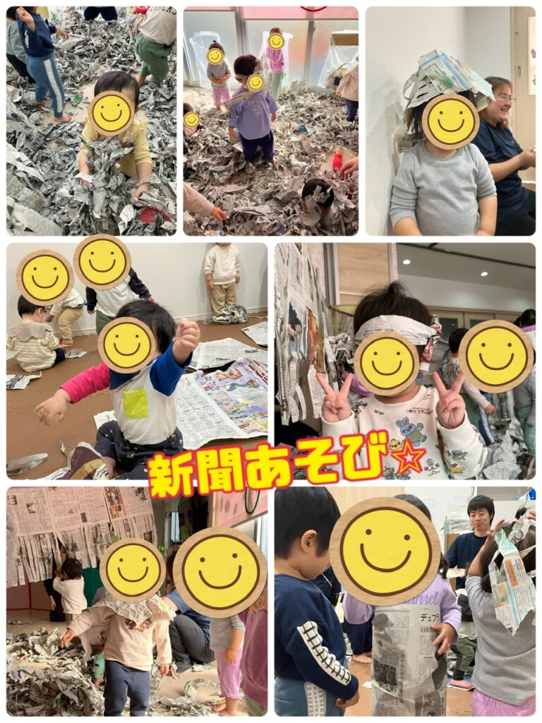 新聞紙📰を体に巻き付けたり、ハチマキを巻いたり創造力を掻き立てながら色んな遊びに挑戦していました♪ 新聞紙カーテンを潜って「いないいないばあ」したり新聞紙の中で泳いだりして地域のお友だちも一緒に楽しい時間を過ごすことが出来ました❣️ 次の園庭開放は12/19です✨また遊びに来てね😆