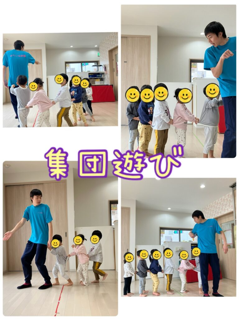 ルールのある動きをしながら歩いたり、しゃがんだり、輪になったりしながら集団遊びにチャレンジしました♪ 少しずつ複雑な動きを取り入れたいですね😊
