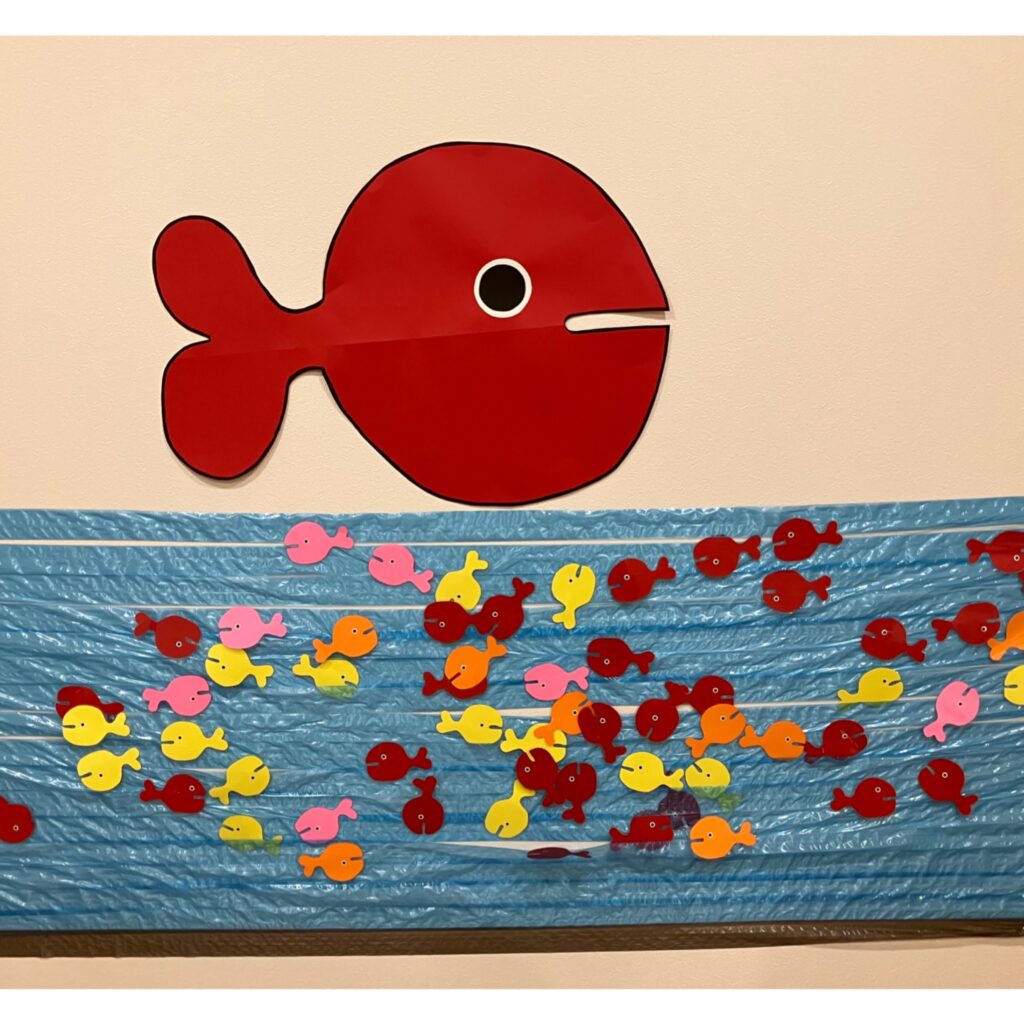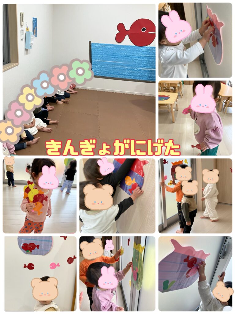 今日はばなな組さんといちご組さんは、「金魚探し」をしましたよ♪ みんな大好き「きんぎょがにげた」の絵本から飛び出したきんぎょさんたちをみんなで水槽に入れてあげました😆