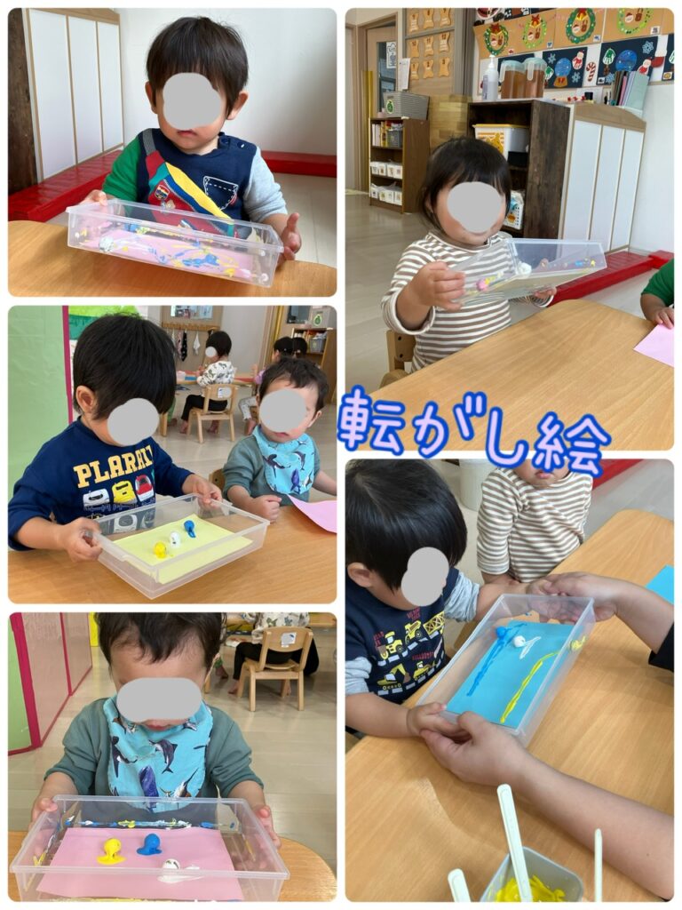 いちご組さんは転がし絵に挑戦です♪ 色を付けたビー玉をコロコロ転がして幻想的な模様が出来上がりました♪ 集中して取り組んでましたよ✨