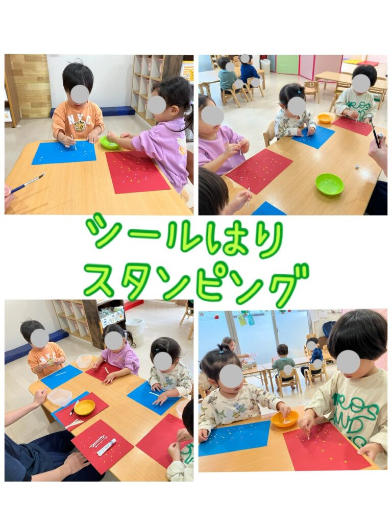 めろん組さんは綿棒を使ってスタンピングに挑戦です♪ 細かい作業でしたが指先で上手に綿棒を持ちペッタンペッタン頑張りましたよ❣️シール貼りも上手に出来ましたね✨