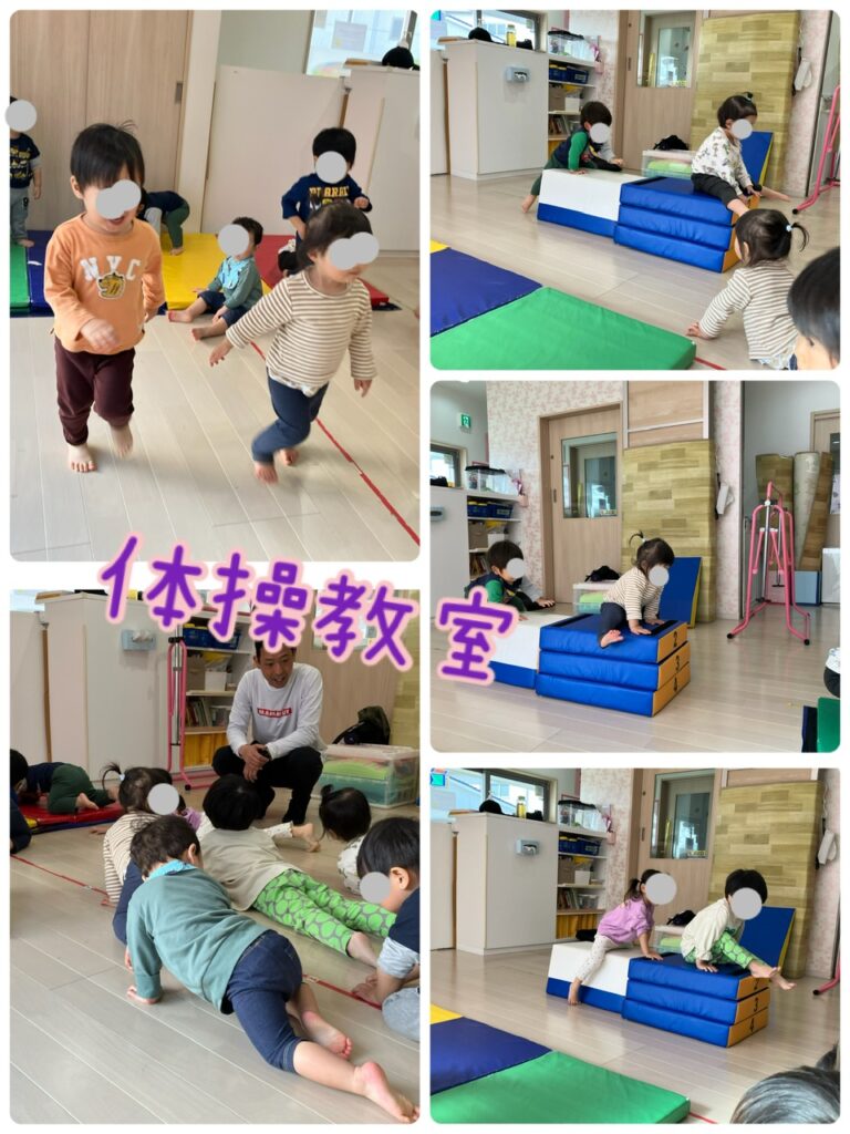 今日はお休みのお友だちが多かったので、いちご組さんとめろん組さん合同で体操教室に参加しました♪ 初めての取り組みでしたが、いちご組さんはめろん組さんの動きを見ていつもより上手に出来ている様に思えました❣️めろん組さんはいちご組さんにいい所を見せようと意欲的に取り組んでましたよ😆