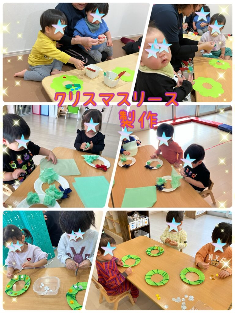 今日は今年度最後の園庭開放の日です♪ 地域のお友だちを招いて皆んなでクリスマスのリース作りを行いましたよ🤶