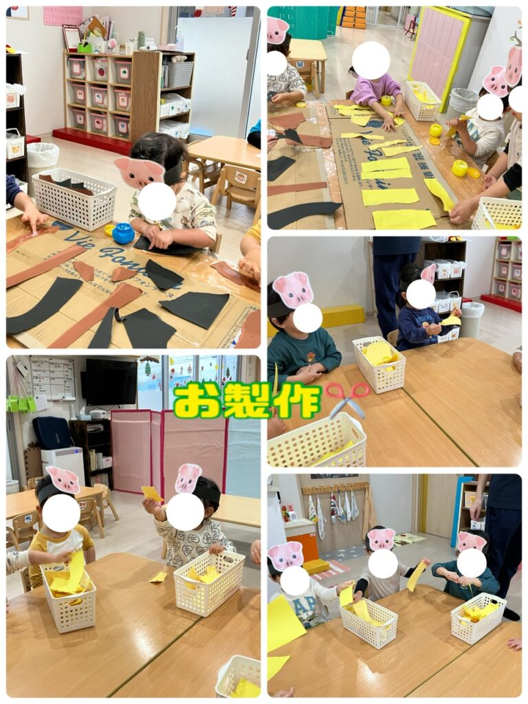 指先にチョコンと糊を付けて、色んな形に千切っている画用紙をダンボール📦に貼り付けていきます✨ これは何か大きな製作物になりそうですよ❣️出来上がりが楽しみです♪