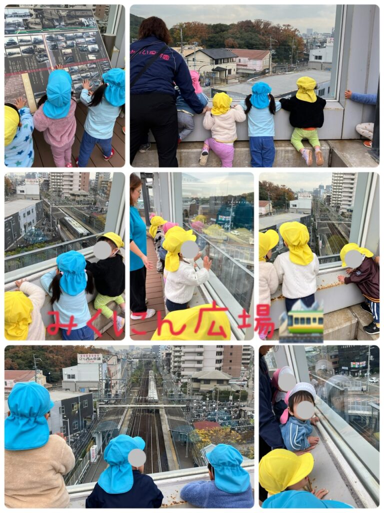 線路🛤️の側道を電車を見ながら移動して、三国ヶ丘駅の上に在る360度の大パノラマ広場に到着しました✨ 上から見る景色は壮大で「電車来た!」「こっちも来た!」皆んな大興奮でガラス越しに手を振っていました♪ めろん組さんは帰路もしっかりと歩き、さすがに疲れてのか皆んなぐっすりお昼寝💤していました✨ 楽しかったね、みくにん広場😊