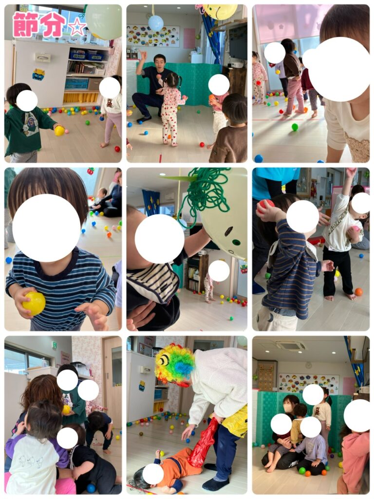 ばなな組さんのお部屋で節分👹にまつわる絵本を読んでもらっている間に、保育室では青鬼、赤鬼、黄鬼の風船出現❣️豆🫘の代わりにボール🟠で皆んなで鬼退治を行いました✨クライマックスには大きな鬼が出て来て皆んな泣きながらボールを当ててました😆