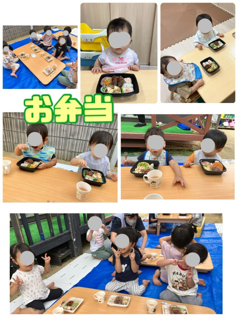 ハンバーグのお弁当🍱は大好評でした❣️いちご組さんとめろん組さんは園庭で遠足気分を満喫していました😊