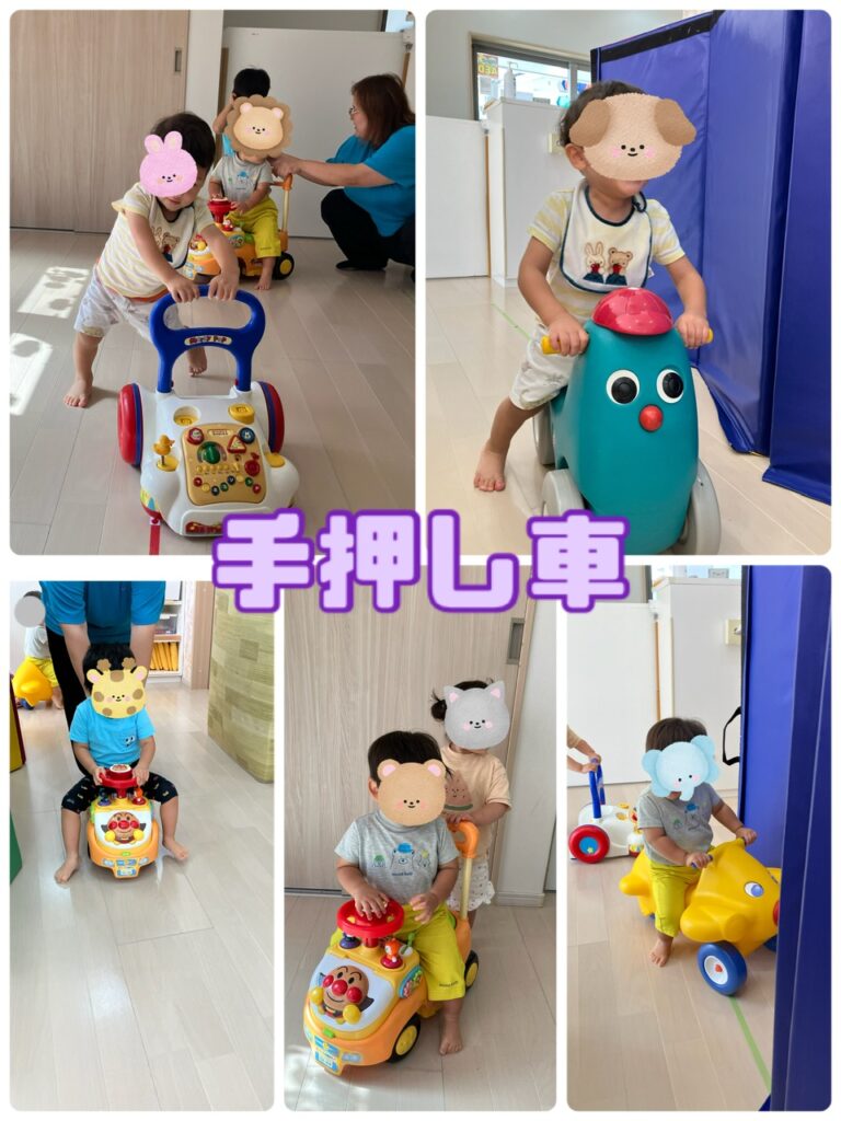 先生に押してもらったり、お友だちの車🚗を押してあげたり色んな車に乗って遊びました♪少し薄暗いマットのトンネルを何回も潜って遊びました♪