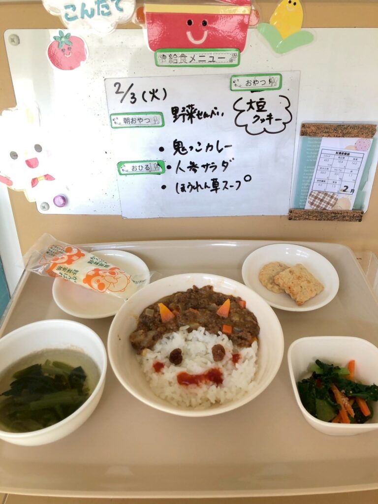 今日の給食 園について みんなの1日 お問い合わせ 未来ブログ 給食 今日の給食~2/3(鬼っ子カレー) 2026.02.03 どれもたくさん食べていました(≧▽≦) 節分は「季節を分ける」という意味があります。日本の伝統的な暦では、季節の変わり目にあたる日を大切にしており、本来は立春、立夏、立秋、立冬のそれぞれの前日が節分でしたが、特に立春は1年の始まりの日として尊ばれたため、節分といえば春の節分を示すようになったようです。 2026年の恵方(縁起が良いとされる方角)は「南南東(やや南)」です。 前の記事へ 一覧へ戻る