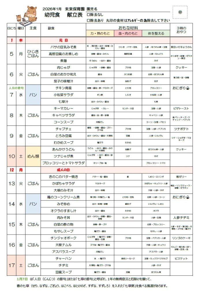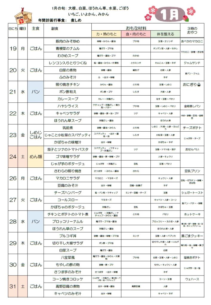 1月の献立。